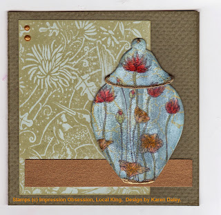 Hello! Here's the next installment of my October Stamping Challenge. I used that same nice ginger jar die cut and a scrap of alcohol ink glossy paper. I stamped the flower (Impress Rubber Stamps) and embossed in gold. The card base is stamped with the same stamp and its solid image counterpart in Azurite chalk ink. The chop (Blockheads) is stamped in Barn Door Distress Ink on an unintentionally jaunty angle. Serves me right for adding it after everything was done! The focal panel has a lovely background stamp (Impress) stamped in Versamagic Aspen Mist. I added a bit of a ground shadow with a Bruynzeel pencil crayon.